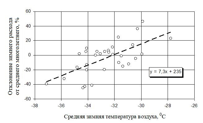 Рис. 7. Связь между отклонениями зимнего расхода малых рек бассейна Алдана от среднего многолетнего и средней зимней температурой воздуха (точки – результаты расчетов по данным наблюдений, штриховая линия – регрессионная прямая по результатам корреляционно-регрессионного анализа)