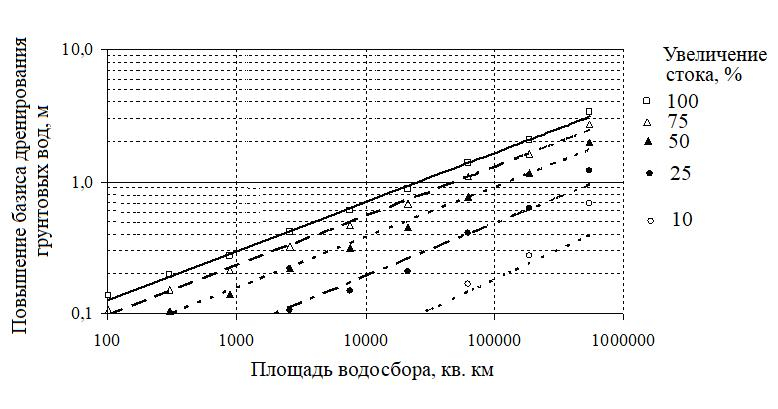 Рис. 8. Связь между повышением базисов дренирования грунтовых вод и площадями водосборов равнинных рек при различном увеличении речного стока в зимнюю межень (по сравнению со средним многолетним)