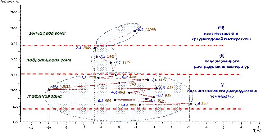Íà äèàãðàììå âèäíî, ÷òî â èíòåðâàëå âûñîò îò 800 äî 1200 ì ðàñïðåäåëåíèå òåìïåðàòóðû ïîðîä íà ãëóáèíå 1 ì èìååò øèðîêèé äèàïàçîí, ò.å. △Òmax ñîñòàâëÿåò 6,1°Ñ (îò -3,9 äî -10,0°Ñ) è îáðàçóåò, òàê íàçûâàåìûé ïîÿñ èíòåíñèâíîãî ðàñïðåäåëåíèÿ òåìïåðàòóð (I), îòíîñÿùèéñÿ ê òà¸æíîé çîíå.