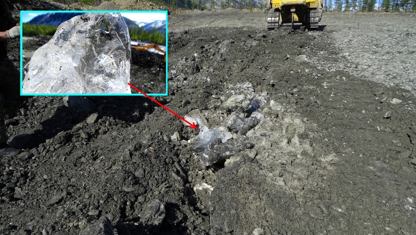 Рис. 4 Повторно-жильный лёд в борту карьера в водно-ледниковых отложениях высокой древней, боковой морены, 2016 г. Фото С.И. Серикова