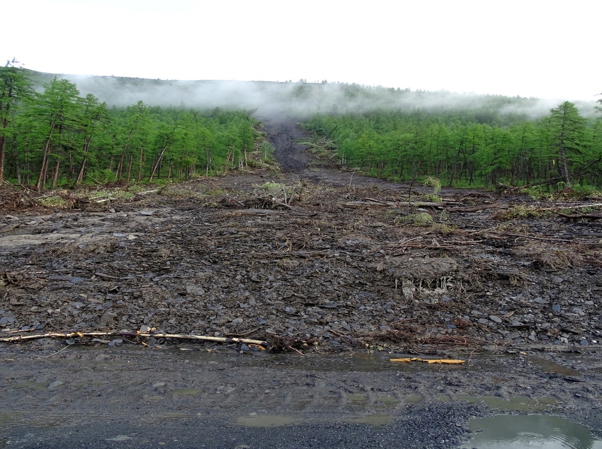 Рис. 5. Оползень криогенного скольжения на южном склоне по подстилающим глинистым сланцам. Июнь 2015 г. Фото С.И. Серикова