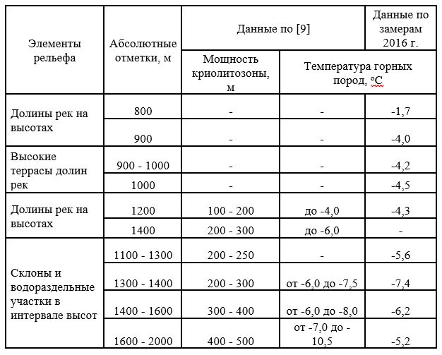 Òàáëèöà 1. Ñðåäíåãîäîâûå òåìïåðàòóðû ãðóíòîâ íà ðàçíûõ óðîâíÿõ è ýëåìåíòàõ ðåëüåôà