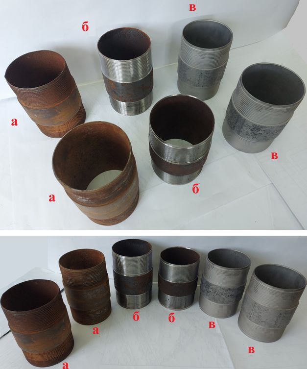 Рис. 1. Опытные образцы ниппелей для соединения обсадных труб, прошедшие газовую вакуумную карбонитрацию, в сопоставлении с необработанными образцами: а – типовые заводские образцы (видно, что эти металлические изделия с резьбой покрыты ржавчиной); б – типовые ниппели со «свеженарезанной» резьбой; в  – карбонитрированные ниппели