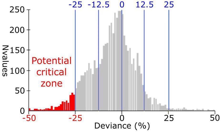 Рис. 4. Определение потенциальной критической зоны сегмента земляной дамбы с помощью графического отображения отклонений от среднего значения для этого сегмента. Значительные отрицательные отклонения указывают на потенциально критический сегмент дамбы [1] (deviance – отклонение от среднего; N values – число измерений; potential critical zone – потенциальная критическая зона)