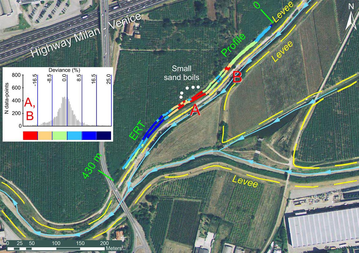 Рис. 5. Карта площадки исследований № 106 (см. рис. 2), на которой показаны два профиля, пройденные многочастотным методом FDEM и методом ERT вдоль основания правой стороны дамбы, ограждающей берег небольшой реки Альпоне, рядом с небольшими песчаными карманами. Результаты анализа аномалий (отклонений от среднего) по записям на канале 7 кГц показывают отрицательные значения, превышающие 17% на участках A и B. Участок A находится прямо наверху песчаного кармана, а на участке B нет никаких поверхностных свидетельств просачивания воды [1] (highway Milan-Venice – автомагистраль Милан – Венеция; levee – земляная дамба; profile – профиль; small sand boils – небольшие песчаные карманы; m, meters – м, метры; N – север; deviance – отклонение от среднего, аномальность; N data-points – число точек измерений)