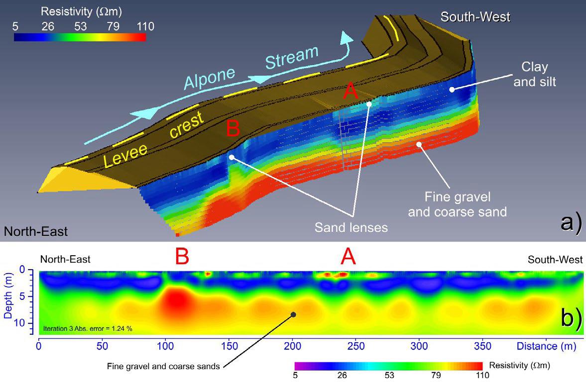 Рис. 6. Профиль ERT, пройденный на площадке исследований № 106 (см. рис. 2) вдоль профиля многочастотного FDEM: a – разрез удельных сопротивлений, включенный в трехмерную модель дамбы; b – профиль удельных сопротивлений. Аномалия A, выявленная при использовании метода FDEM, соответствует приповерхностному высокоомному слою. Аномалия B, обнаруженная с помощью FDEM, может наблюдаться из-за слегка высокоомного приповерхностного слоя и заметного поднятия кровли нижележащих гравийных отложений [1] (resistivity (Om) – удельное сопротивление, Ом; Alpone stream – река (ручей) Альпоне; levee crest – гребень земляной дамбы; sand lenses – песчаные линзы; clay and silt – глина с илистыми (пылеватыми) отложениями; gravel and coarse sand – мелкий гравий с крупнозернистым песком; north-east – северо-восток; south-west – юго-запад; distance – расстояние; depth – глубина; m – м)