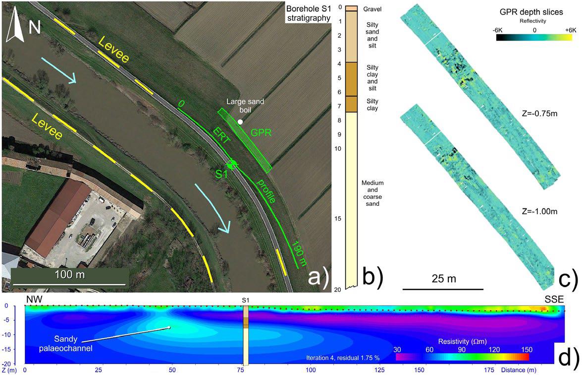 Рис. 8. Геофизические и геотехнические исследования на площадке № 115 (см. рис. 2): a – карта площадки № 115, на которой была выполнена съемка многоканальным георадаром (GPR) рядом с крупным песчаным карманом; b – стратиграфия по данным бурения скважины S1; c – горизонтальные сечения трехмерных георадиолокационных записей GPR для высотных отметок от поверхности (глубин) Z, показывающие аномальную отражательную способность, вызванную образованием в результате суффозии песчаных карманов; d – профиль ERT, частично пройденный по гребню дамбы (относительно высокоомное тело представляет собой песчаный палеоканал, расположенный на несколько метров ниже основания дамбы) [1] (N – север; levee – земляная дамба; ERT profile – электротомографический профиль; m – м; large sand boil – большой песчаный карман; borehole S1 stratigraphy – стратиграфическая колонка по данным бурения скважины S1; gravel – гравий; silty sand and silt – илистый (пылеватый) песок и илистые (пылеватые) отложения; silty clay – илистая (пылеватая) глина; medium and coarse sand – средне- и крупнозернистый песок; GPR depth slices – горизонтальные сечения трехмерных георадиолокационных записей для глубин Z; Z – высотная отметка от поверхности (глубина); resistivity (Om) – удельное сопротивление, Ом; reflectivity – отражательная способность; K – тысяч (кило-, к); m – м; distance – расстояние; sandy paleochannel – песчаное палеорусло; NW – СЗ; SSE – ЮЮВ; iteration – итерация; residual – невязка)