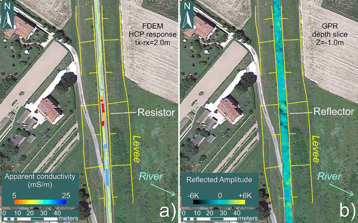 Авторами статьи [1] для быстрой и недорогой визуализации внутренней структуры сотен километров береговых земляных дамб и их грунтовых оснований вдоль рек Северной Италии был испробован подход, основанный на интеграции двух геофизических методов – электромагнитного индукционного частотного профилирования (FDEM) и многоканальной георадиолокационной съемки (GPR). Достоверность полученных с помощью этой технологии данных была подтверждена с помощью более медленного и дорогого в использовании метода электротомографии (ERT).