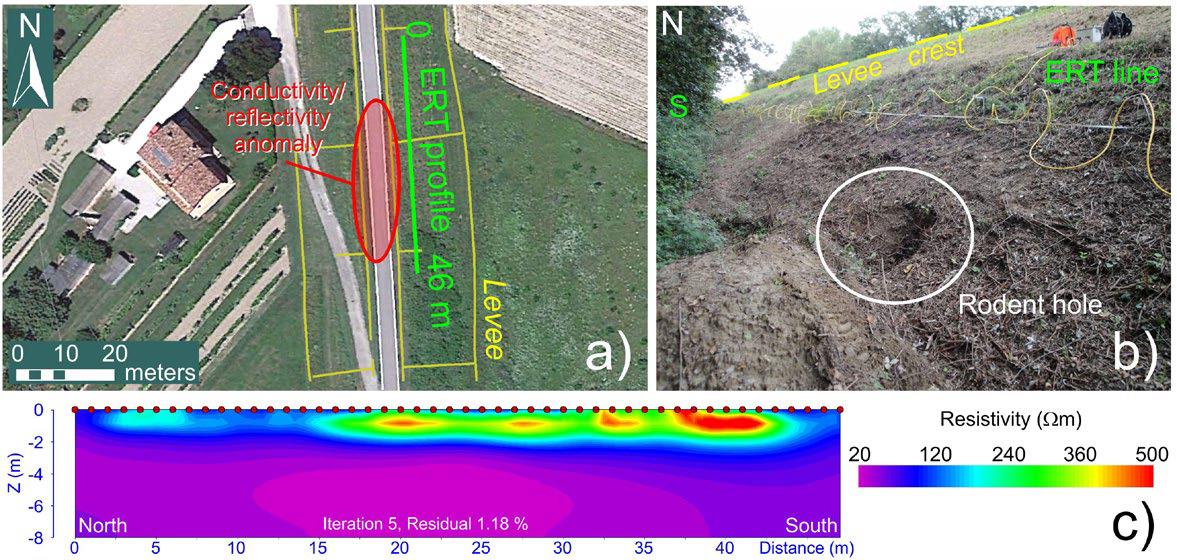 С точки зрения участников исследования [1], подкрепленной ссылками на других авторов, наиболее эффективным для картирования аномалий и корреляции геофизических свойств с геотехническими и гидравлическими параметрами является профилирование методом электротомографии (ERT – electrical resistivity tomography). Этим методом можно получать подробные двумерные и трехмерные изображения подповерхностной среды. Но электротомографическая съемка является довольно медленной и слишком дорогой, поэтому она не подходит для мониторинга тысяч километров береговых земляных дамб в Северной Италии (где их общая длина составляет примерно 15 тыс. км). Сейсмическое профилирование и емкостное зондирование (capacitive coupling resistivity) связаны с частым перемещением тяжелого и объемного оборудования, поэтому они тоже не очень подходят для обширных съемок.