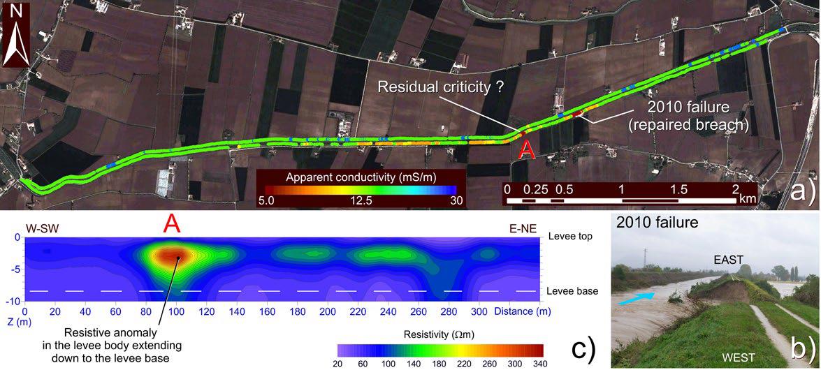 Уровень развития современного общества, особенно в равнинных районах, требует конкретных и точных знаний о рисках, связанных с разрушением земляных дамб вдоль берегов или пойм рек во время паводков (рис. 1). Ведь даже отдельный прорыв в таком сооружении может привести к наводнению и нанести экономический ущерб до нескольких десятков и даже сотен миллионов евро, не говоря уже о человеческих жертвах. В том числе недавние примеры в Северной и Центральной Италии показали, что экстремальные явления могут приводить к неожиданным разрушениям береговых дамб, в то время как лучше было бы заранее получать информацию о слабых местах в этих сооружениях и своевременно их усиливать. В начале своей статьи [1] Франчезе с соавторами указали, что экономически эффективный непрерывный мониторинг внутренней структуры береговых земляных дамб с высокой скоростью и достаточно хорошим разрешением могут дать только геофизические методы.