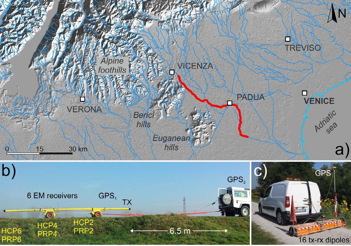 Рис. 12. Экспериментальный проект получения данных с помощью геофизических исследований вдоль земляных дамб реки Баккильоне недалеко от Венеции: a – карта, показывающая исследуемую территорию; b – многокатушечная система FDEM; c – многоканальная георадарная установка [1] (N – север; Alpine foothills – предгорья Альп; VICENZA – Виченца; PADUA – Падуя; VENICE – Венеция; TREVISO – Тревизо; VERONA – Верона; Berici hills – холмы Беричи; Euganean hills – Эуганские (Юганские) холмы; Adriatic sea – Адриатическое море; km – км; EM resivers – приемники электромагнитного излучения (приемные катушки); TX – генератор электромагнитного излучения (генераторная катушка); HCP – горизонтальное копланарное расположение катушек; PRP – перпендикулярное расположение катушек; GPS – приемник глобальной системы позиционирования GPS; m – м; tx-rx dipoles – пары приемо-передающих диполей)