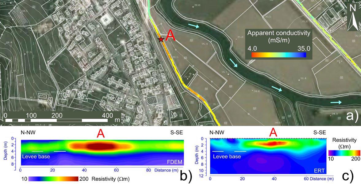 Рис. 13. Геофизические обследования земляных дамб вдоль берегов и пойм реки Баккильоне: a – карта, на которой показано распределение кажущейся удельной электропроводности по данным, полученным на 4-метровом горизонтальном копланарном канале, то есть при горизонтальном копланарном расположении катушек и расстоянии между генераторной и приемной катушками 4 м (А – аномалия низкой удельной электропроводности); b – результат инверсии данных FDEM (виден высокоомный / проницаемый элемент, расположенный в теле дамбы); c – картина, полученная при измерениях по профилю ERT для валидации результатов инверсии данных FDEM (значения удельного сопротивления полностью сопоставимы) [1] (N – север; apparent conductivity (mS/m) – кажущаяся удельная электропроводность (обратная удельному сопротивлению), мСм/м (миллисименс на метр); m – м; N-NW – С-СЗ; S-SE – Ю-ЮВ; depth – глубина; distance – расстояние; resistivity (Om) – удельное сопротивление, Ом; levee base – основание земляной дамбы)