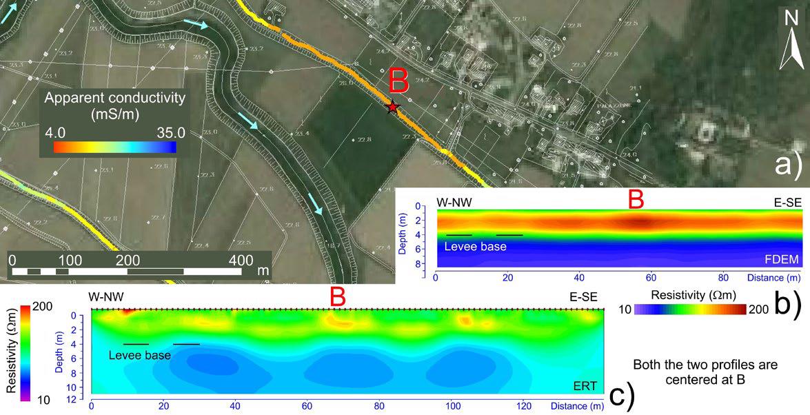 Рис. 14. Геофизические исследования вдоль земляных дамб, ограждающих берега и поймы реки Баккильоне: a – карта, на которой показано распределение кажущейся удельной электропроводности по данным, полученным на 4-метровом горизонтальном копланарном канале (B – аномалия низкой удельной электропроводности); b – результат инверсии данных FDEM (виден высокоомный / проницаемый элемент, расположенный в теле дамбы); c – картина, полученная при измерениях по профилю ERT для валидации результатов инверсии данных FDEM (значения удельного сопротивления на 15–20% ниже, чем по результатам инверсии данных FDEM) [1] (N – север; apparent conductivity (mS/m) – кажущаяся удельная электропроводность (обратная удельному сопротивлению), мСм/м (миллисименс на метр); m – м; W-NW – З-СЗ; E-SE – В-ЮВ; depth – глубина; distance – расстояние; resistivity (Om) – удельное сопротивление, Ом; levee base – основание земляной дамбы)