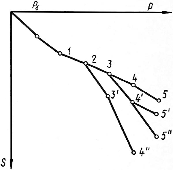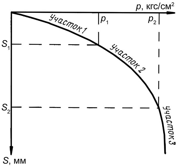 Впервые теоретическое обоснование поведения грунта в основании жесткого штампа при его нагрузке было выполнено Н.М. Герсевановым в 1930 году. Согласно его представлениям, основанным на работах предшественников и на его собственном изучении графиков испытаний грунта штампом пробными нагрузками, поведение грунта под нагрузкой претерпевает три последовательные фазы: фаза уплотнения – фаза сдвигов – фаза выпора. На графике зависимости осадки штампа от нагрузки (см. рис. 2) приведено [4, стр. 19] разграничение этих фаз, они представлены на рисунке участками 1–3. Впервые этот рисунок появился в более ранних работах у самого Н.М. Герсеванова, впоследствии его повторяли многие известные ученые.