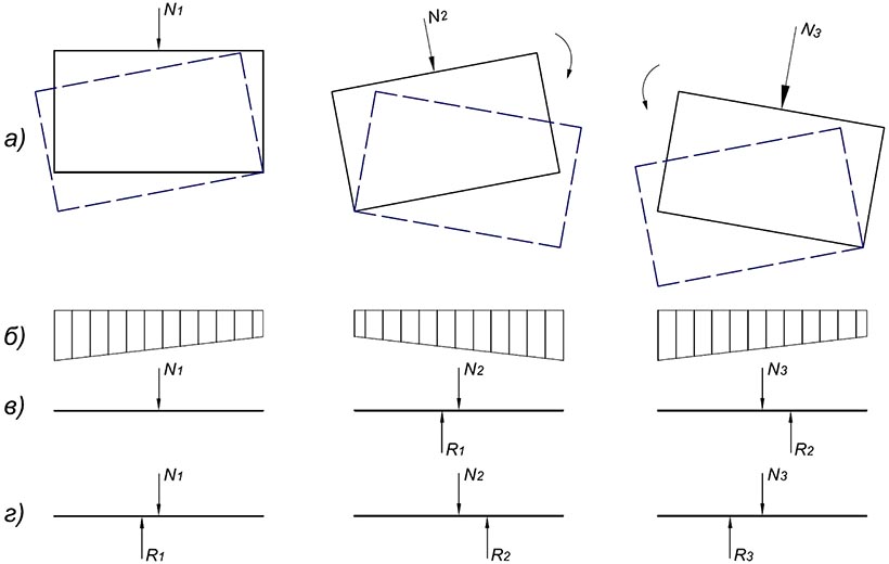 На рис. 4 изображена концепция автора, отображающая поведение грунта на примере первых трех ступеней нагрузок в процессе испытания грунта штампом. После полной стабилизации осадок на первой ступени нагрузки, переданной штампу, равнодействующая опорной реакции грунта в основании штампа становится ассиметричной относительно центра штампа уже в силу хотя бы банальной неоднородности грунта, всегда имеющей место. В результате возникшей асимметрии создается эксцентриситет сил, и последующая очередная ступень нагрузки приводит к возникновению момента, направленного в сторону прослабленного, менее плотного участка основания штампа. Как правило, этот участок находится близко или непосредственно на прямо противоположном квадранте штампа, именно под которым основание и подвергается теперь наибольшему уплотнению, приводящему к тому, что наклон штампа вновь претерпевает изменение. Таким образом, асимметричность реакции отпора сохраняется, но приобретает противоположное направление.