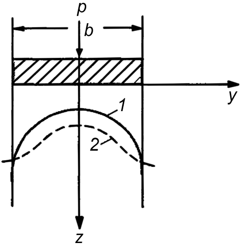 Рис. 5. Теоретическая (1) и экспериментальная (2) эпюра контактных напряжений по классическим представлениям