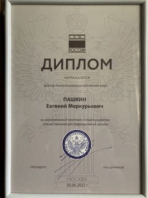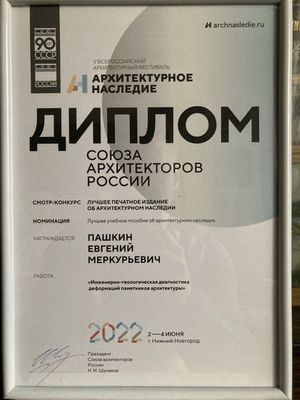 В 2022 году увидело свет четвертое издание монографии Евгения Меркурьевича Пашкина «Инженерно-геологическая диагностика деформаций памятников архитектуры». В июне на пятом Съезде Союза архитекторов России в Нижнем Новгороде книга получила диплом этой организации как лучшее печатное издание об архитектурном наследии. Случай неординарный и, наверное, уникальный. Ранее геологам, насколько нам известно, не присуждались подобные архитектурные награды.