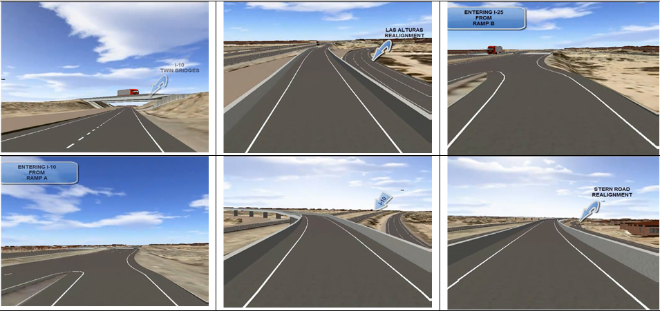 Рис. 4. На скриншотах из 3D-модели, полученной в программе InfraWorks, показаны участки реконструкции двойного моста и некоторых подъездных и прилегающих дорог. Изображения любезно предоставлены Департаментом транспорта штата Нью-Мексико США