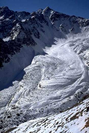Кеннер с соавторами [7] отмечают, что на склонах крутизной более 30 град. сильнольдистые и очень сильнольдистые многолетнемерзлые грунты переходят в состояние непрерывного разрушения (когда напряжение сдвига превышает локальную прочность на сдвиг). Если фронтальная часть каменного глетчера достигает более крутой подстилающей поверхности, то из нее высвобождается каменный материал в виде камнепадов, потоков обломочного материала или даже селей, что в основном ограничивается частичным или полным обрушением деятельного слоя. Однако в некоторых случаях могут обрушиться бОльшие части всего каменного глетчера в виде крупной каменно-ледяной лавины.