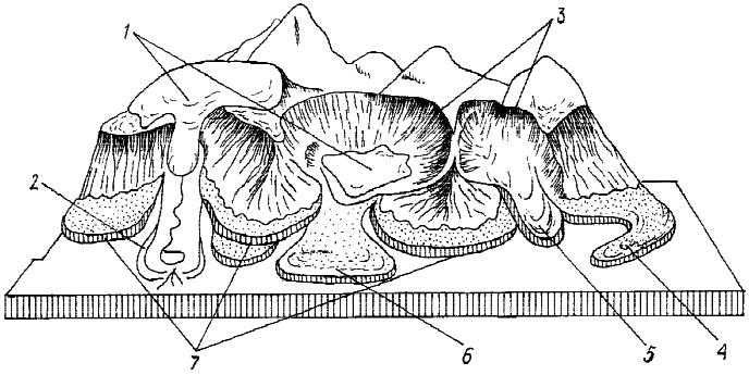 Рис. 7. Генетические и морфологические типы каменных глетчеров: 1 – ледники; 2 – ледниковые морены; 3 – кары (цирки); 4 – осыпной присклоновый языковидный каменный глетчер; 5 – ледниковый долинный языковидный каменный глетчер; 6 – долинный лопастевидный (лопатообразный) каменный глетчер; 7 – осыпной террасовидный каменный глетчер [1]