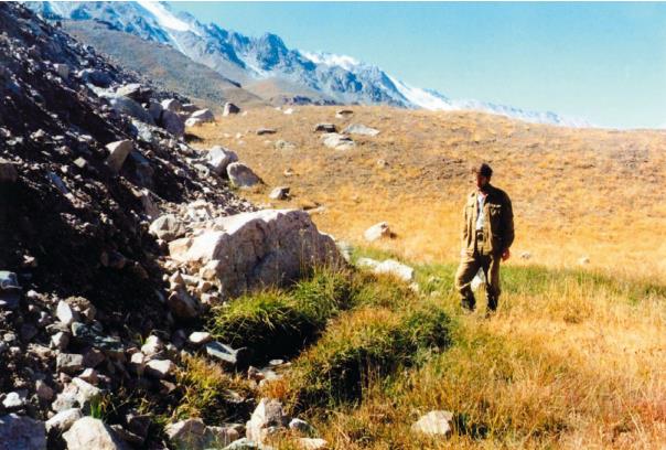 Рис. 8. Дерновые валики напора у подножия уступа-откоса каменного глетчера в Северном Тянь-Шане [1]