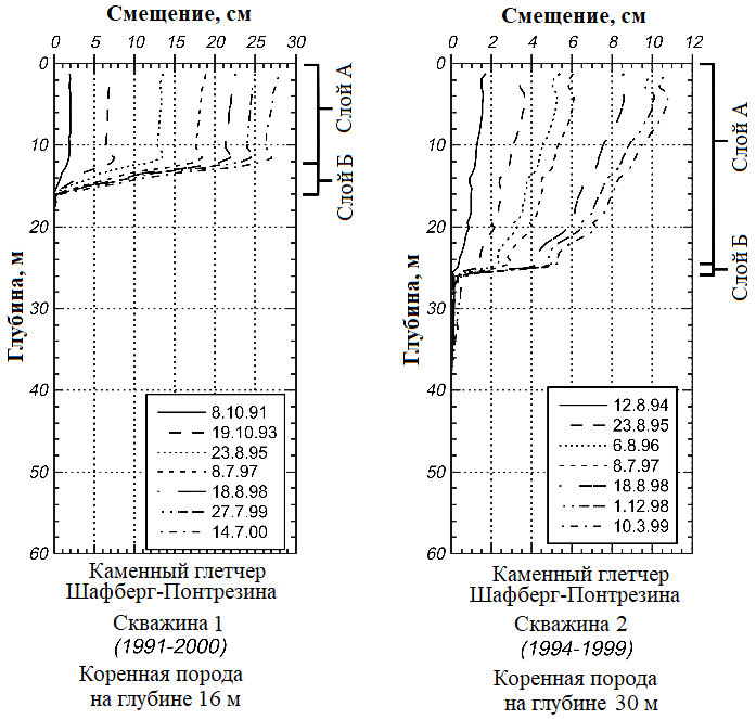 Как отмечают Кеннер с соавторами [7], в зонах зарождения каменных глетчеров или в относительно небольших или холодных каменных глетчерах деформации ползучести могут составлять 50% от всех деформаций. Доля сдвиговых деформаций и, соответственно, скорость движения растут вниз по склону, а также с увеличением его крутизны (если слой, в котором преобладают деформации сдвига, относится к слабольдистому многолетнемерзлому грунту, то скорость сдвига также может зависеть от его температуры). Многие из исследованных зон сдвига в каменных глетчерах расположены близко к подошве многолетней мерзлоты, что, вероятно, связано с идеальным сочетанием самых высоких температур многолетнемерзлых грунтов, самого большого напряжения и сосуществования воды и избытка льда.