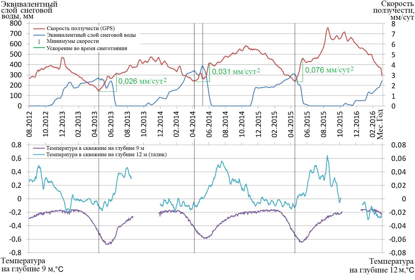 Рис. 10. Временные ряды показывают одновременное начало (вертикальные черные линии): 1 – таяния снега (синяя кривая); 2 – потепления талика, указывающего на приток воды к горизонту сдвига (бирюзово-голубая кривая); 3 – ускорения движения каменного глетчера Ритиграбен (красная кривая и зеленые пометки) в Швейцарских Альпах [3, 5]