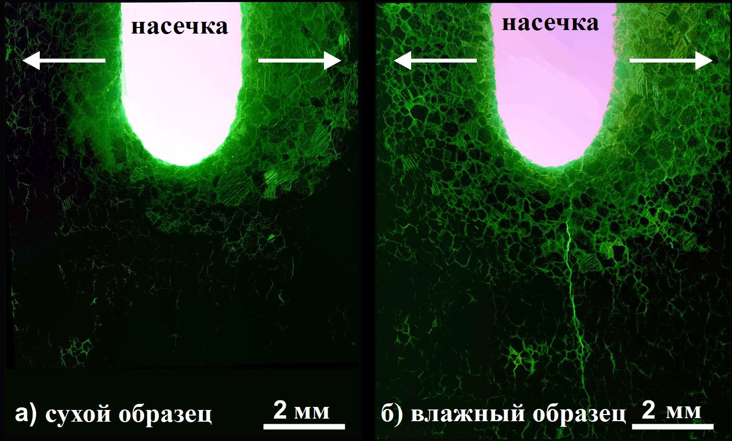 Рис. 20. Два шлифа каррарского мрамора под флуоресцентным микроскопом во время испытаний на изгиб (образцы фиксировались в их центрах, а затем медленно нагружались по краям, причем место разрушения задавалось выпиленной насечкой): а – сухой образец во время испытания (не наблюдается развивающейся одиночной трещины); б – насыщенный водой образец во время испытания (четко видна траектория разрушения по границам зерен) [3, 9]