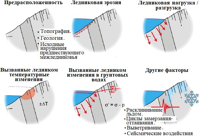 Рис. 33. Факторы подготовки нестабильности парагляциального скального склона (по [2, 3])