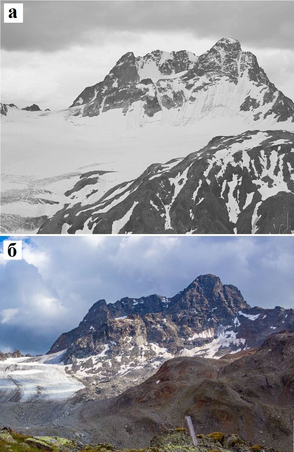 Рис. 34. Северный фланг вершины Пиц-Кеш в Швейцарских Альпах в середине августа 1936 года (а) и 2020 года (б). В 1936 году крутые скальные склоны были полностью покрыты ледяными фартуками, от которых в 2020 году почти ничего не осталось. При этом явно возросла интенсивность камнепадов разных объемов (вплоть до 150 000 куб. м). Ранее чистый ледник Порчабелла (видный как сплошной белый покров на рисунке «а») теперь почти полностью покрыт обломочным материалом (что хорошо видно на рисунке «б») [3]