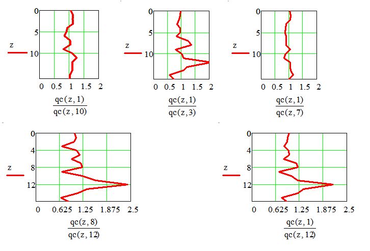 Рис. 3. Графики отношений qc в разных выработках до глубины 16 м