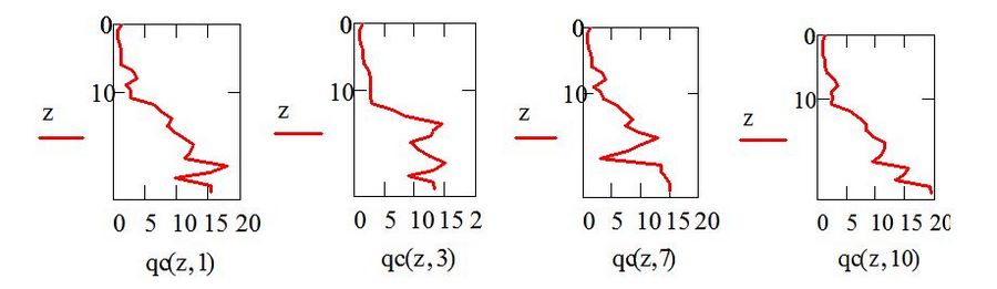 Рис.2. Графики зондирования (qc), полученные аппроксимацией по таблице данных из выработок с номерами 1, 3, 7 и 10 до глубины 15 м