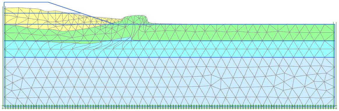 Рис. 2. Использование модели слабого грунта с эффективными прочностными характеристиками. Есть разрушение (стабильность не обеспечена)