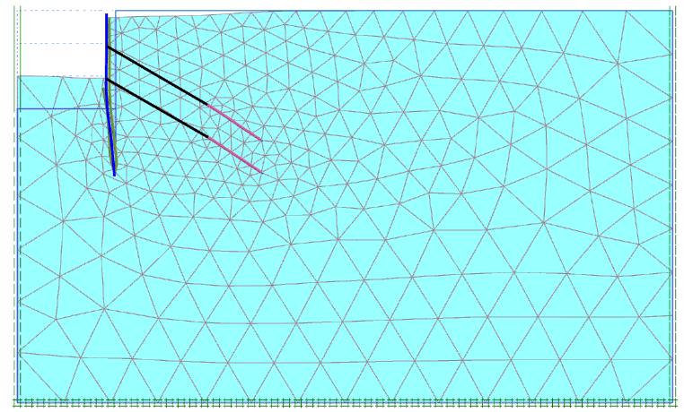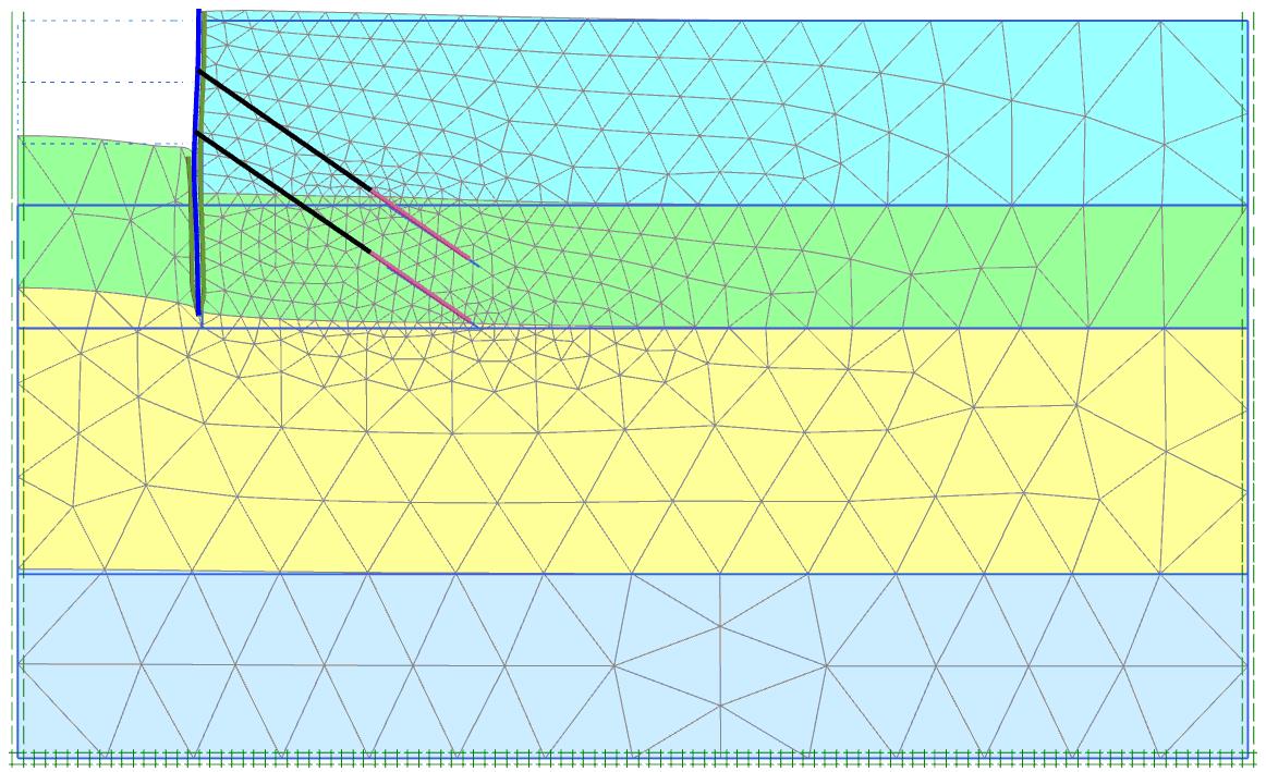 На рисунках 3 и 4 показаны результаты моделирования поэтапной выемки грунта с поддержкой бортов котлована подпорной стенкой, усиленной грунтовыми анкерами, с использованием соответственно простой и усовершенствованной моделей.