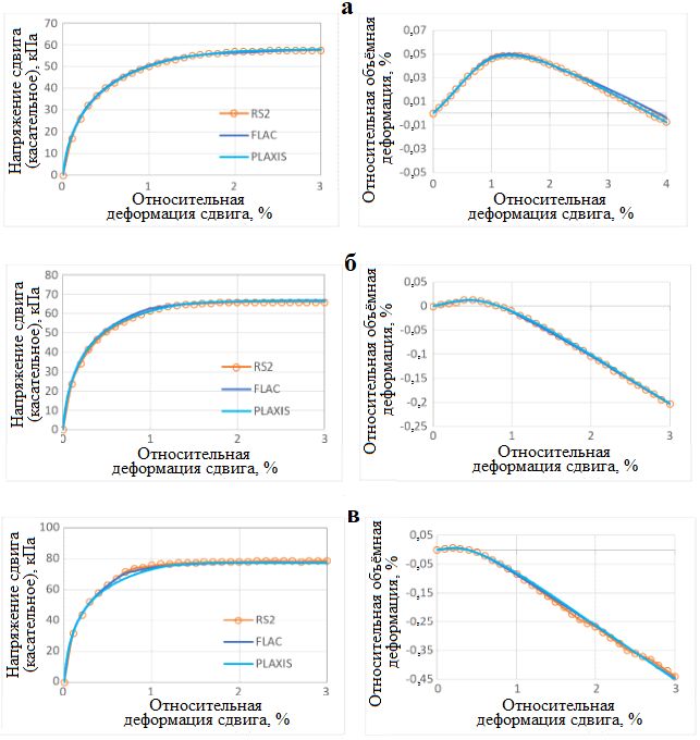 На рисунке 6 показаны результаты испытаний пылеватого грунта на многоплоскостной сдвиг при циклическом нагружении в недренированных условиях. Моделирование в программе FLAC проводилось с контролем деформаций, а направление приложения нагрузки изменялось при достижении определенного уровня напряжения сдвига. В то время как моделирование в RS2 и PLAXIS выполнялось с контролем напряжений. Из рисунка 6 видно, что имеется хорошее соответствие между результатами работы во всех трех рассматриваемых программах [1].
