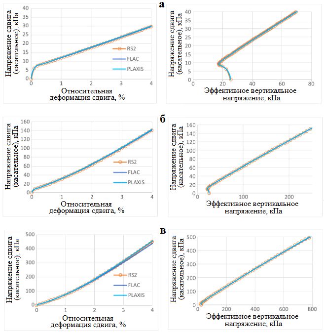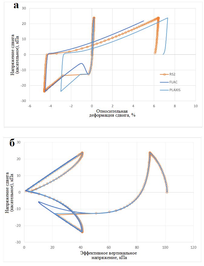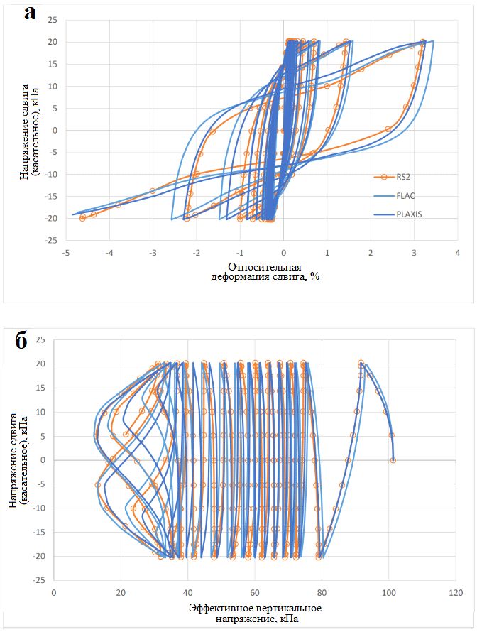 Результаты виртуальных испытаний песчаного грунта на многоплоскостной сдвиг при циклическом нагружении в недренированных условиях, представленные на рисунке 3, также демонстрируют хорошее соответствие для программ RS2, FLAC и PLAXIS. Хотя все же есть небольшие различия при более поздних циклах нагружения. Основными причинами этого являются различия в применении сдвиговой нагрузки и в критериях сходимости. В программе FLAC моделирование испытаний велось с контролируемыми деформациями, а направление приложения нагрузки изменялось при достижении определенного уровня напряжения сдвига. Тогда как в программах RS2 и PLAXIS моделирование выполнялось с контролируемыми напряжениями. Несмотря на то, что критерии сходимости между результатами работы во всех трех рассматриваемых программах широко используются на практике, незначительные ошибки в конце каждого этапа (цикла) нагружения могут накапливаться, если количество этапов очень велико. В остальном результаты, полученные в RS2, FLAC и PLAXIS, хорошо совпадают [1].