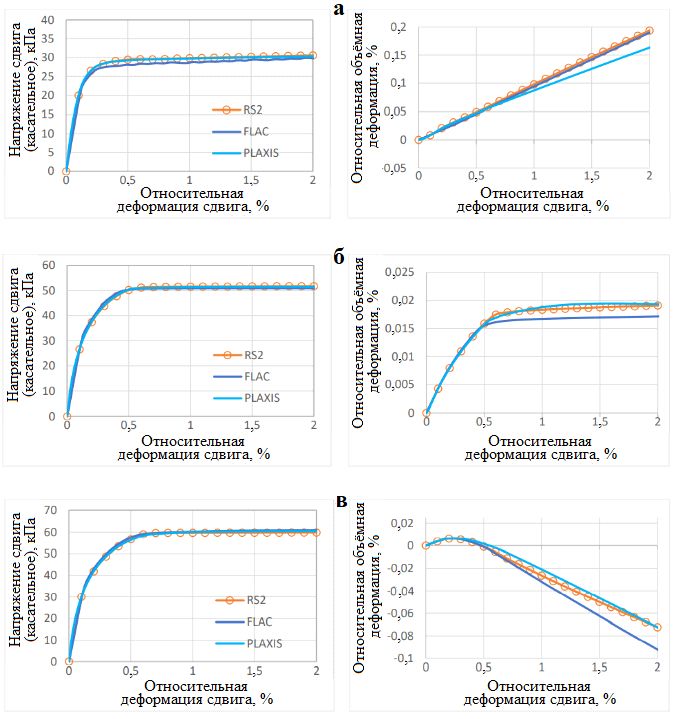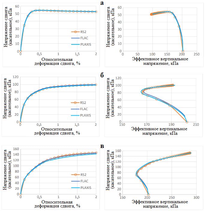 Рис. 4. Результаты виртуальных испытаний пылеватого грунта на многоплоскостной сдвиг при монотонном нагружении в дренированных условиях при отношении su/σ‘vc, равном 0,25 (а), 0,50 (б) и 0,75 (в), начальном вертикальном эффективном напряжении величиной 1Pатм и коэффициенте бокового давления грунта в состоянии покоя Ko=0,5 (при использовании модели PM4Silt в программах RS2, FLAC и PLAXIS)