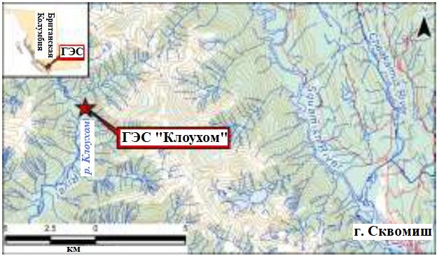 Рис. 1. Место строительства гидроэлектростанции на реке Клоухом в 27 км от города Сквомиш в провинции Британская Колумбия на западе Канады [1]