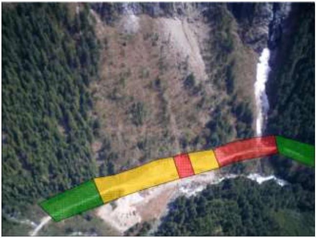 Участки низкой, средней и высокой вероятности негативных последствий от возможных камнепадов, которые могли бы быть опасными для подъездной дороги (и находящихся ниже нее объектов), а также для напорного трубопровода и работающих там людей во время почти двух лет строительства объектов ГЭС, показаны на рисунке 4 зеленым, желтым и красным цветом соответственно (на основе качественных оценок). Но в долгосрочной перспективе почти вся территория под рассматриваемым скалистым склоном может пострадать от камнепадов.