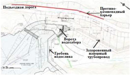 Рис. 5. План водозаборных сооружений и противокамнепадного барьера [1]
