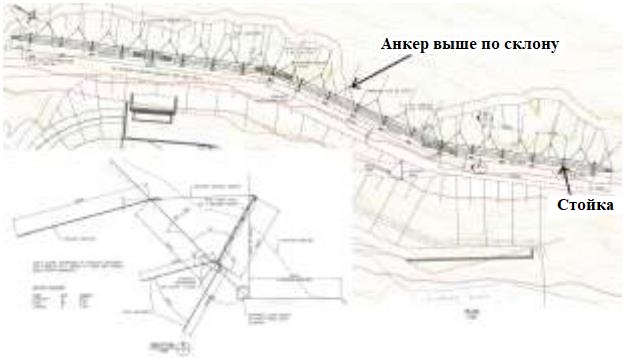 Конструкция включала по два грунтовых анкера и по две микросваи («надетых» на анкеры) в фундаментах стоек и по два троса-оттяжки, идущих от верха каждой стойки и закрепленных анкерами выше по склону (что значительно удешевило фундаменты стоек), а также по две дополнительных боковых оттяжки, идущих от верха крайних стоек и тоже закрепленных анкерами (см. рис. 6–8). Использовались преимущественно самозабуривающиеся буроинъекционные анкеры с полым стержнем (поскольку они устанавливались в очень слабых осыпных грунтах, предварительное бурение в большинстве случаев выполнять было невозможно или нецелесообразно, поэтому при монтаже анкеров бурение и цементация производились в основном одновременно или почти одновременно). Анкеры устанавливались с помощью буровой установки с выдвижной стрелой. Конечная глубина бурения варьировала. Если в конце скважины встречалась твердая порода, длина анкера уменьшалась, так как между анкером и твердым грунтом с помощью цемента могло возникнуть надежное скрепление. Для цементации через полый стержень анкера вводилась смесь цементного раствора Mircosil® Anchor Grout пополам с водой. Расчетные нагрузки для анкеров опор, анкеров боковых оттяжек и анкеров оттяжек, идущих вверх по склону, составляли 110; 170 и 202 кН соответственно. Случайным образом выбранные анкеры были тщательно протестированы на выдерживание этих нагрузок.