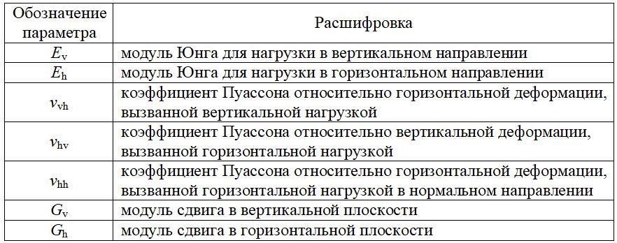 Таблица 1. Параметры упругости для поперечно-изотропного материала с горизонтальной плоскостью изотропии (по [1])