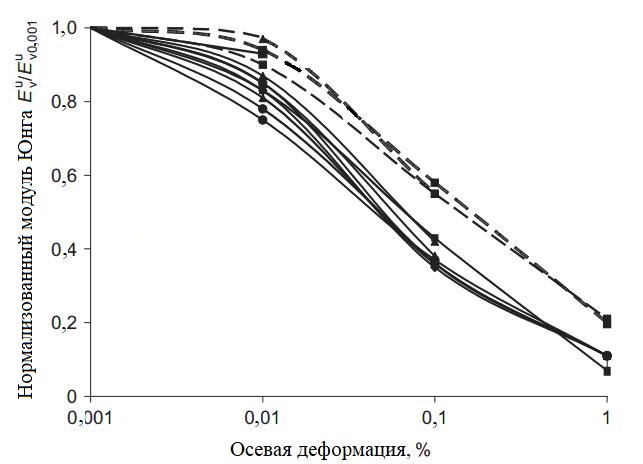 Типичные уровни деформаций вокруг геотехнических сооружений (подпорных стенок, сплошных фундаментов, свай, тоннелей), попадают в диапазон, в котором жесткость грунта изменяется с деформациями наиболее резко (для многих сооружений  это диапазон 0,010,1%) (см. рис. 1). Таким образом, для прогнозирования смещений дисперсного или слабого скального грунта требуются не только оценки жесткости при очень малых деформациях, но и данные по деградации жесткости (рис. 2).
