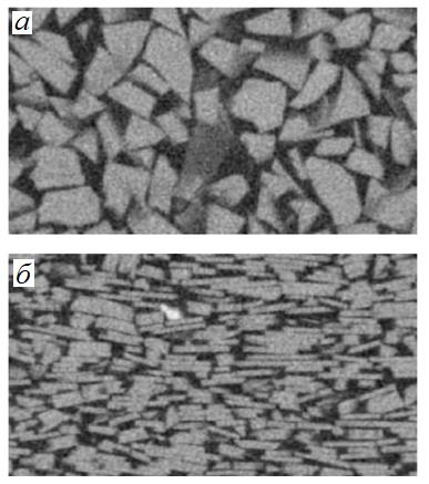 Рис. 3. Результаты компьютерного томографического сканирования, показывающие предпочтительную ориентацию рыхло насыпанных пластинчатых частиц размером 1 мм: а – горизонтальный разрез (вид сверху); б – вертикальный разрез (вид сбоку). Ясно, что в этом случае жесткость будет выше в горизонтальной плоскости, чем в вертикальной [1]