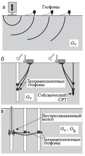 Рис. 5. Три общепринятых метода полевых сейсмических исследований: а – испытания с использованием системы непрерывных поверхностных волн Рэлея (CSW); б – скважинные сейсмические исследования; в – межскважинные сейсмические исследования [1]