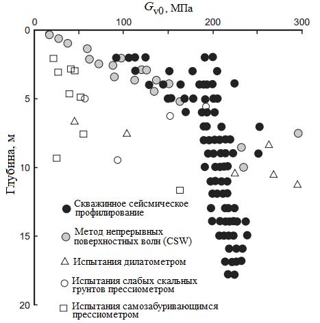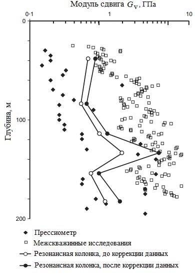 Сопоставление результатов определения вертикального модуля сдвига при очень малых деформациях при использовании резонансной колонки, прессиометрических испытаний и межскважинных сейсмических исследований представлено на рисунке 11.