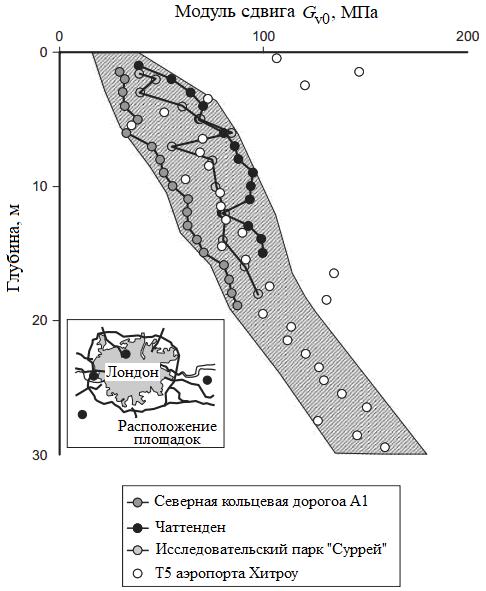 Рис. 7. Вертикальные модули сдвига (Gv) в зависимости от глубины по результатам четырех межскважинных сейсмических исследований в лондонской глине вокруг Лондона. Видна хорошая согласованность данных. Исключения составляют некоторые точки для района аэропорта Хитроу предположительно из-за наличия слоя гравия на поверхности земли [1]