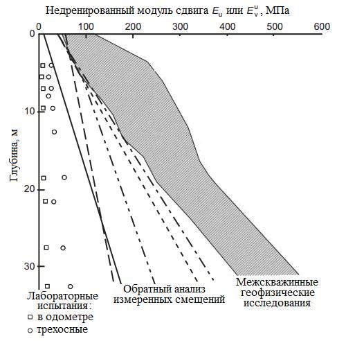 Рис. 8. Модули Юнга в зависимости от глубины для лондонской глины по результатам межскважинных геофизических исследований, обратного анализа измеренных смещений и обычных лабораторных испытаний [1]