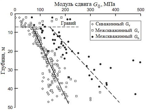 Скважинные и межскважинные исследования дают схожие оценки вертикального модуля сдвига Gv, хотя результаты первых почти всегда несколько ниже, чем вторых (рис. 9). Это объясняется тем, что измеренное время прохождения волны при скважинных испытаниях является результатом усреднения скоростей в пластах слоистого грунта, а при межскважинных исследованиях измеренная жесткость скорее всего будет представлять самые жесткие слои, а не среднюю величину.