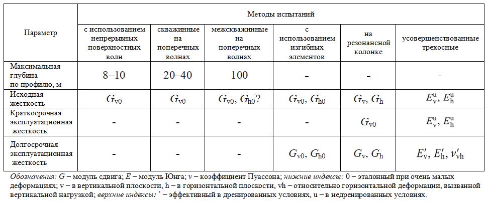 Методы определения параметров жесткости при очень малых деформациях в полевых условиях с использованием сейсмических геофизических методов и в лабораторных условиях с помощью изгибных элементов, испытаний на резонансной колонке и в трехосном приборе имеют большие перспективы, хотя и не лишены проблем.